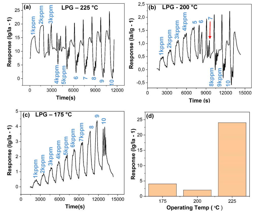 The α-Fe2O3 and Ru-α-Fe2O3 based sensors were fabricated, with various percentages of Ruthenium, in this study. Testing was done on different flammable gases, including LPG, propane, ammonia, ethanol, and hydrogen sulfide (H2S) for both α-Fe2O3 and Ru-α-Fe2O3 samples. In this experiment, α-Fe2O3 exhibited a switching n-p transition at the operating temperature of 225 °C upon LPG detection. The results of the experiment showed that ammonia exhibited high sensitivity and selectivity. However, upon the addition of Ru in alpha iron oxide, the selectivity, and sensitivity shifted to Liquefied petroleum gas (LPG) (Figure7a). The operating temperature of the system was controlled to study the occurring anomalous n-p switching transition. By further decreasing the operating temperature of the system to 200 °C and 175 °C it was observed that the n-p switching transition depends on the operating temperature. As shown (in Figure7b-7c)) n-p switching transition was delayed at a lower operating temperature of 200 °C and only five cycles showed n-types material while the switching transition of starting between the concentration of 6000 to 7000 ppm of LPG, and it was further observed that only three cycles show p-types material from 8000 to 1000 ppm. This suggests that a further decrease in operating temperature will lead to further delay in the occurrence of the n-p type carrier transition, though the sensor’s response might reduce, and is shown in Figure 7c. In addition, increasing the concentration of the LPG caused a delay in the formation of the transition of the material this is shown in Figure7b.