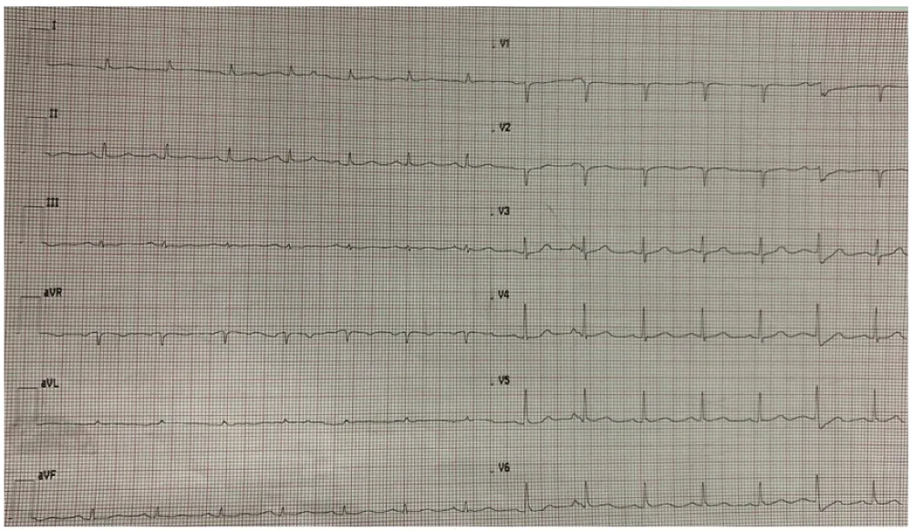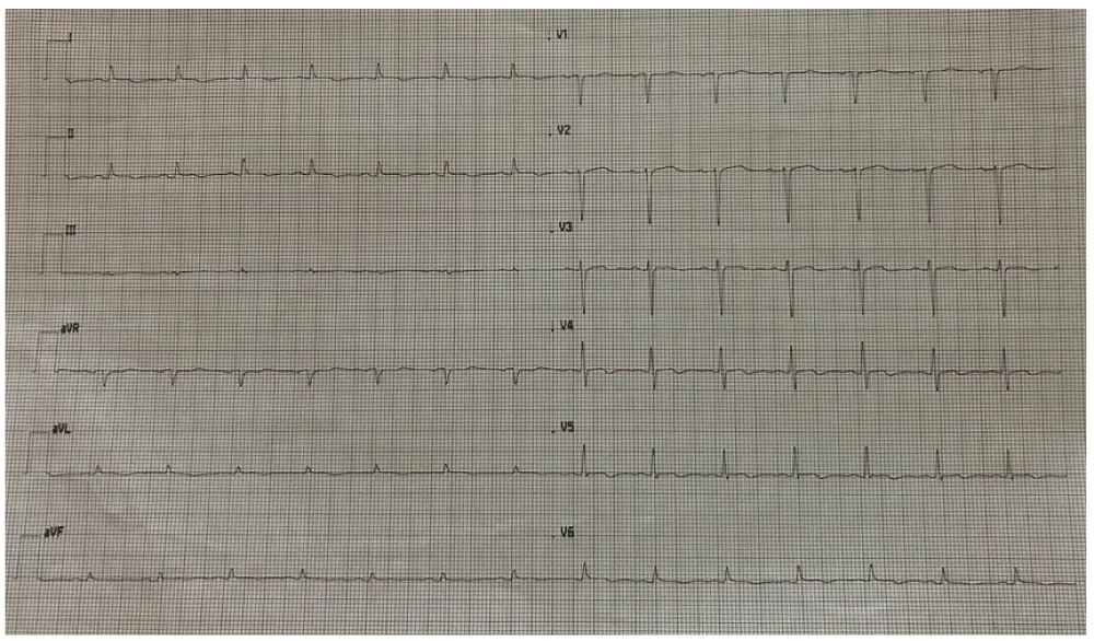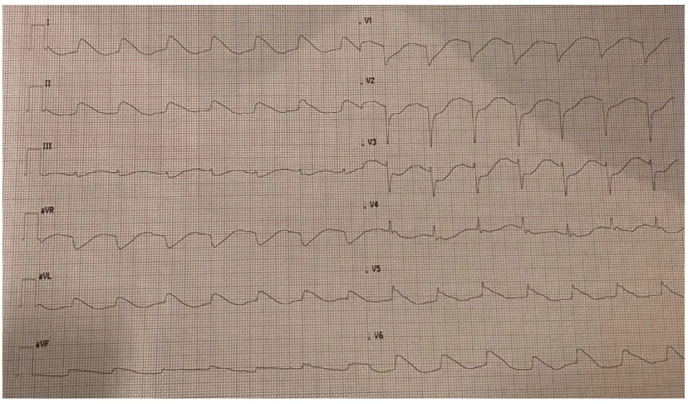 Within 24 hours, as the patient’s hemodynamics stabilized and inflammatory markers decreased, serial ECGs (Image 5) showed progressive normalization of repolarization changes, ultimately returning to baseline with sinus rhythm, a narrow QRS, and residual signs of chamber overload. A metallic esophageal stent was subsequently placed. Unfortunately, the patient later developed acute respiratory distress syndrome requiring prone positioning, though no new ECG changes were observed. At the time of writing, the patient remains hospitalized.