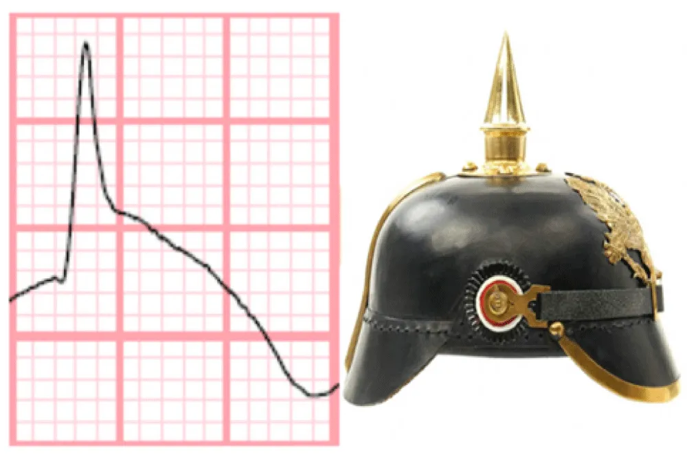 The Spiked Helmet Sign (SHS), also known as the “Pickelhaube sign,” derives its name from its resemblance to the pointed Prussian military helmet, with dome-and-spike ST-segment elevation preceding the QRS [1]. First reported in 2011 by Littmann, et al. [2], it has been increasingly associated with non-cardiac, life-threatening conditions [2]. A 2023 systematic review included 39 patients, with 19 deaths. Subsequent reports brought the total to 52 cases, with male patients exhibiting higher mortality [3-14]. Although the precise pathophysiology remains unclear, proposed mechanisms include abnormal diaphragmatic contractions due to acute intrathoracic or intra-abdominal pressure changes, vagal stimulation, and sympathetic overdrive [1,14]. SHS has been observed in intracranial hemorrhage, pulmonary disease, gastric distention, abdominal pathology, and, as in our case, postsurgical septic shock [1]. Prompt recognition is essential, as SHS may signal severe underlying disease even in the absence of cardiac involvement.
