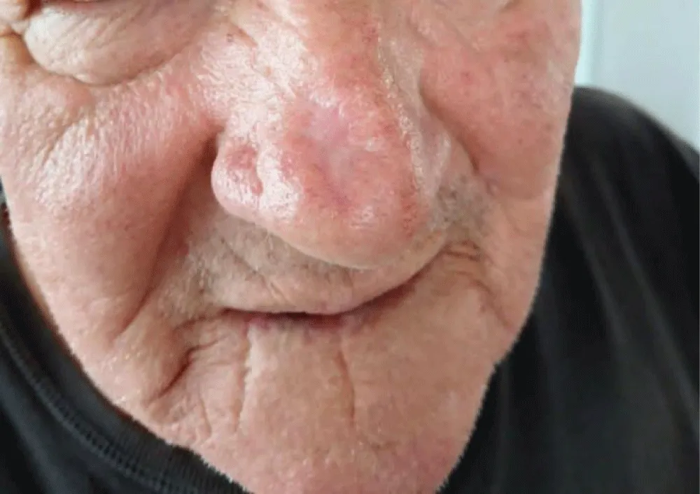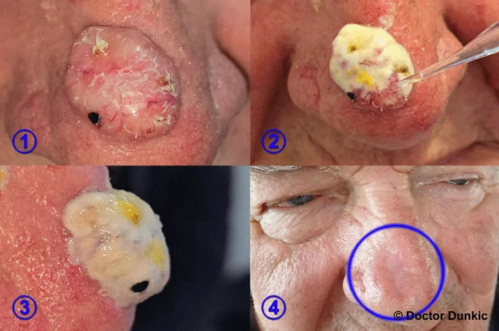 In this context, we present a case of nodular, non-pigmented BCC of the nose treated with a proprietary chemical method developed by Dr. G. Dunkic. This non-invasive approach, based on topical application of a liquid preparation, has been used for decades in clinical practice and offers a potential alternative for patients unwilling or unable to undergo surgery. This report aims to describe the clinical outcome of this treatment and to discuss its possible role within the spectrum of dermatological therapies.
