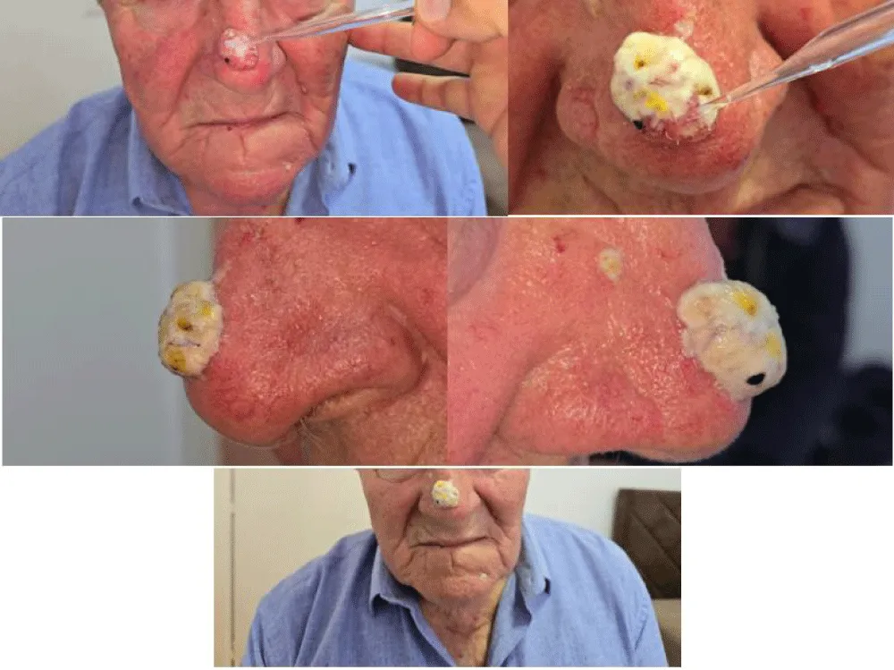 The global incidence of basal cell carcinoma continues to rise, with more than two million new cases diagnosed annually. This increase is largely attributed to aging populations and cumulative ultraviolet exposure. Lesions located on the nose are particularly challenging due to the cosmetic and functional importance of this area, often requiring careful consideration of both therapeutic efficacy and aesthetic outcomes. Consequently, there is growing interest in exploring less invasive treatment modalities that may provide satisfactory results while minimizing patient discomfort and preserving tissue integrity.