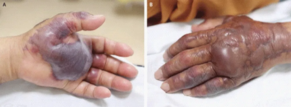 In this case, the initial hand lesion was untreated, leading to cellulitis with ecchymosis and hemorrhagic bullae after three days. Despite an occlusive dressing with antiseptic, the cellulitis became necrotic, spreading to the extremity with black and purple eschars, chills, and fever by day five. A maculopapular eruption with necrosis and petechiae on the arms and legs developed. Oral ampicillin was administered, but the condition progressed to abdominal pain and hypotension.